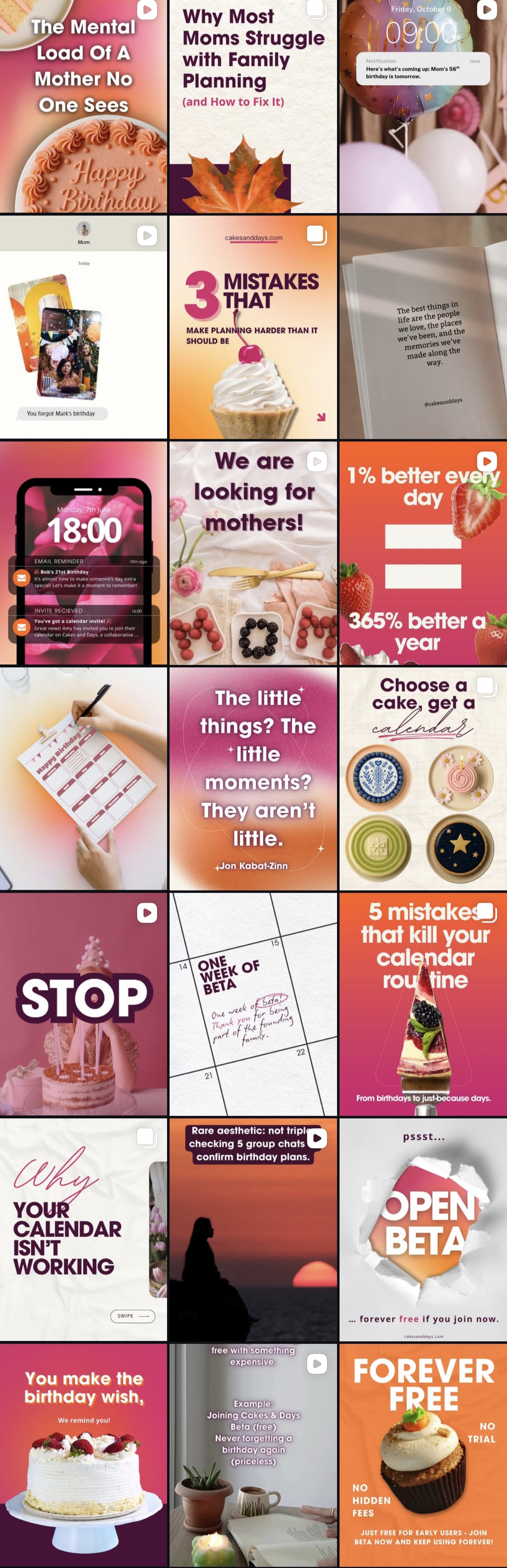A Cakes & Days egy családoknak szánt digitális termék, amelynek vizuális és tartalmi kommunikációját már a béta szakaszban elkezdtük építeni. A cél egy elkötelezett közösség kiépítése, nem csupán vásárlók megszólítása. A projekthez az induláskor egy kész logó és színpaletta állt rendelkezésre, minden más tartalomgyártási feladatot én látok el.